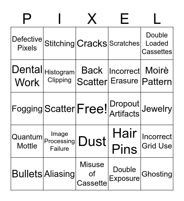 This bingo card has a free space and 24 words: Image Processing Failure, Aliasing, Back Scatter, Bullets, Double Loaded Cassettes, Defective Pixels, Dental Work, Stitching, Dropout Artifacts, Dust, Incorrect Erasure, Fogging, Hair Pins, Incorrect Grid Use, Histogram Clipping, Double Exposure, Jewelry, Cracks, Moirè Pattern, Scatter, Ghosting, Quantum Mottle, Scratches and Misuse of Cassette.