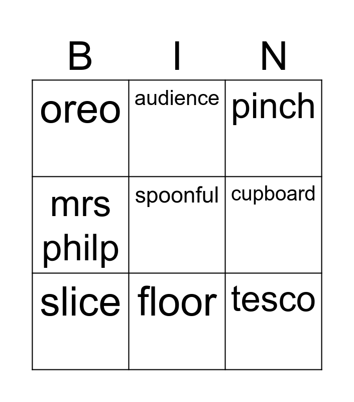 This bingo card has 9 words: slice, pinch, audience, mrs philp, oreo, cupboard, spoonful, tesco and floor.