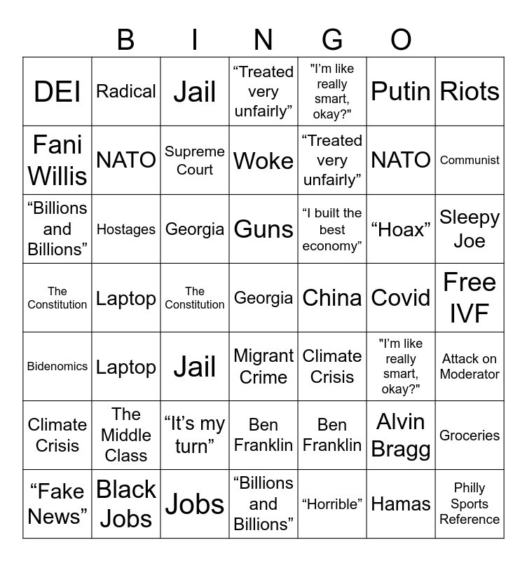 This bingo card has a free space and 160 words: Free!, Kamala’s cackle, "I’m like really smart, okay?", "Nasty”, “You feel me?", The Wall, China, Hamas, Peace Deal, Illegal Criminals, Putin, Afghanistan, Jail, “Fake News”, “I built the best economy”, “The likes of which we’ve never seen”, “I’m talking”, “It’s my turn”, Dream, Abortion, Coup, Indictment, Sleepy Joe, Woke, January 6, Kamala Coverup, DEI, Bidenomics, Weaponization, Gas Prices, Rigged Election, The Middle Class, Laptop, Alvin Bragg, Fani Willis, Riots, Insurrection, Tim Walz, JD Vance, Democrat Run Cities, Supreme Court, Fauci, Covid, Inflation Blame Game, California, Jobs, Open Borders, “Excuse Me”, Free IVF, Project 2025, Attack on Moderator, Black Jobs, Coconut, The Constitution, “The Birthplace of Democracy”, Philly Sports Reference, “Brat”, “Hoax”, “Crossroads”, “Weird”, “Billions and Billions”, “Treated very unfairly”, Ben Franklin, Candidate Misses a cue, “Horrible”, NATO, Migrant Crime, Radical, Insulin, Communist, Tariffs, Disinformation, Climate Crisis, Hostages, “They love me”, Fentanyl, Guns, Pelosi, Groceries, Witch Hunt, Kamala’s cackle, "I’m like really smart, okay?", "Nasty”, “You feel me?", The Wall, China, Hamas, Peace Deal, Illegal Criminals, Putin, Afghanistan, Jail, “Fake News”, “I built the best economy”, “The likes of which we’ve never seen”, “I’m talking”, “It’s my turn”, Dream, Abortion, Coup, Indictment, Sleepy Joe, Woke, Georgia, January 6, Kamala Coverup, DEI, Bidenomics, Weaponization, Gas Prices, Rigged Election, The Middle Class, Laptop, Alvin Bragg, Fani Willis, Riots, Insurrection, Tim Walz, JD Vance, Democrat Run Cities, Supreme Court, Fauci, Covid, Inflation Blame Game, California, Jobs, Open Borders, “Excuse Me”, Free IVF, Project 2025, Attack on Moderator, Black Jobs, Coconut, The Constitution, “The Birthplace of Democracy”, Philly Sports Reference, “Brat”, “Hoax”, “Crossroads”, “Weird”, “Billions and Billions”, “Treated very unfairly”, Ben Franklin, Candidate Misses a cue, “Horrible”, NATO, Migrant Crime, Radical, Insulin, Communist, Tariffs, Disinformation, Climate Crisis, Hostages, “They love me”, Fentanyl, Guns, Pelosi, Groceries and Witch Hunt.