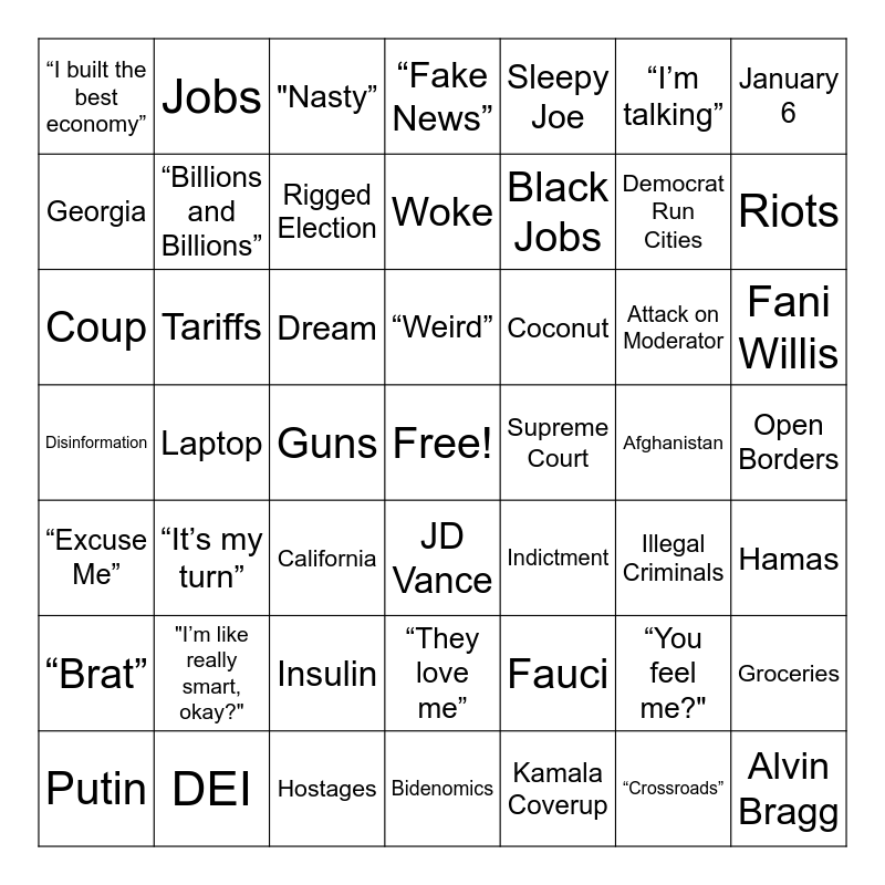 This bingo card has a free space and 80 words: Kamala’s cackle, "I’m like really smart, okay?", "Nasty”, “You feel me?", The Wall, China, Hamas, Peace Deal, Illegal Criminals, Putin, Afghanistan, Jail, “Fake News”, “I built the best economy”, “The likes of which we’ve never seen”, “I’m talking”, “It’s my turn”, Dream, Abortion, Coup, Indictment, Sleepy Joe, Woke, Georgia, January 6, Kamala Coverup, DEI, Bidenomics, Weaponization, Gas Prices, Rigged Election, The Middle Class, Laptop, Alvin Bragg, Fani Willis, Riots, Insurrection, Tim Walz, JD Vance, Democrat Run Cities, Supreme Court, Fauci, Covid, Inflation Blame Game, California, Jobs, Open Borders, “Excuse Me”, Free IVF, Project 2025, Attack on Moderator, Black Jobs, Coconut, The Constitution, “The Birthplace of Democracy”, Philly Sports Reference, “Brat”, “Hoax”, “Crossroads”, “Weird”, “Billions and Billions”, “Treated very unfairly”, Ben Franklin, Candidate Misses a cue, “Horrible”, NATO, Migrant Crime, Radical, Insulin, Communist, Tariffs, Disinformation, Climate Crisis, Hostages, “They love me”, Fentanyl, Guns, Pelosi, Groceries and Witch Hunt.