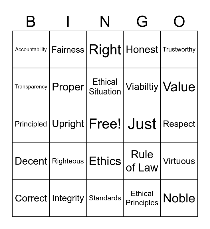 This bingo card has a free space and 26 words: Ethics, Ethical Principles, Ethical Situation, Integrity, Trustworthy, Accountability, Transparency, Fairness, Respect, Rule of Law, Viabiltiy, Principled, Virtuous, Correct, Upright, Responsible, Honest, Decent, Right, Noble, Value, Standards, Just, Righteous, Proper and Fitting.