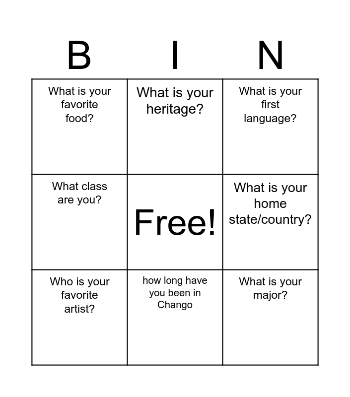 This bingo card has a free space and 8 words: What is your home state/country?, What is your first language?, What is your heritage?, Who is your favorite artist?, What is your favorite food?, What is your major?, What class are you? and how long have you been in Chango.