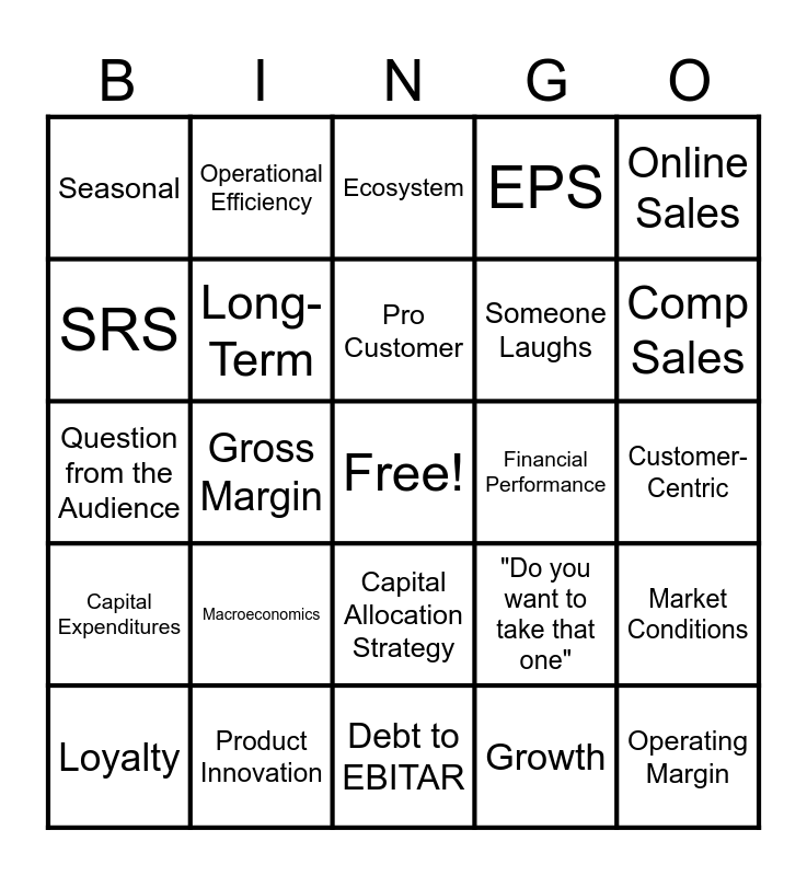 This bingo card has a free space and 24 words: Macroeconomics, Product Innovation, Pro Customer, Loyalty, Online Sales, Seasonal, SRS, Operational Efficiency, Financial Performance, Capital Allocation Strategy, Someone Laughs, Question from the Audience, "Do you want to take that one", Market Conditions, Long-Term, Growth, Customer-Centric, Ecosystem, Comp Sales, Gross Margin, Operating Margin, Capital Expenditures, EPS and Debt to EBITAR.