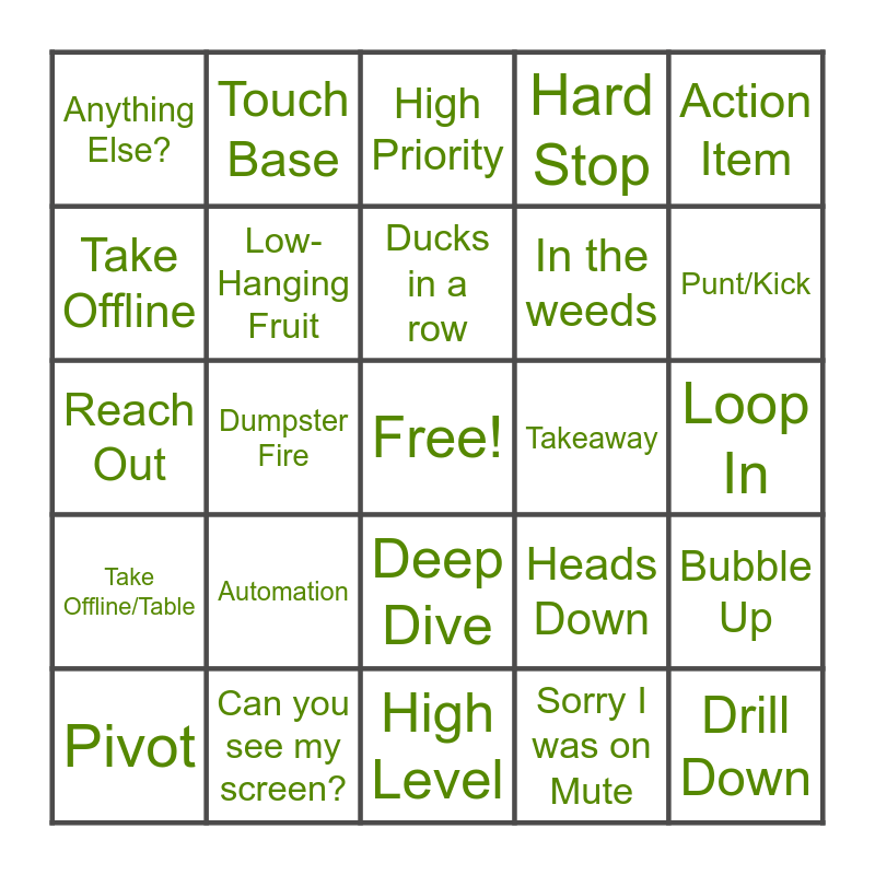 This bingo card has a free space and 54 words: Put a Pin in it, Take Offline/Table, I'll Give you Back x Minutes, Circle Back, Deep Dive, We'll give it just another minute, Hard Stop, Bandwidth, Take Offline, Showstopper, Anything Else?, You're on mute, Can you see my screen?, Pivot, Bring back to the Surface, High Level, Drill Down, In the weeds, Leverage, Loop In, Heads Down, Ping, Takeaway, Action Item, Touchpoint, Touch Base, Back Burner, Backlog, Paradigm Shift, Sorry I was on Mute, Housekeeping, Continuity, Finish Line, Critical, High Priority, Pulse, Reach Out, Bubble Up, Tick and Tie, Low-Hanging Fruit, At the End of the Day, Agile, Best Practice, Wheelhouse, Automation, Quick win, DevOps, On your radar, Ducks in a row, Dumpster Fire, Punt/Kick, Sidebar, Deliverable and Hop on a Quick Call.