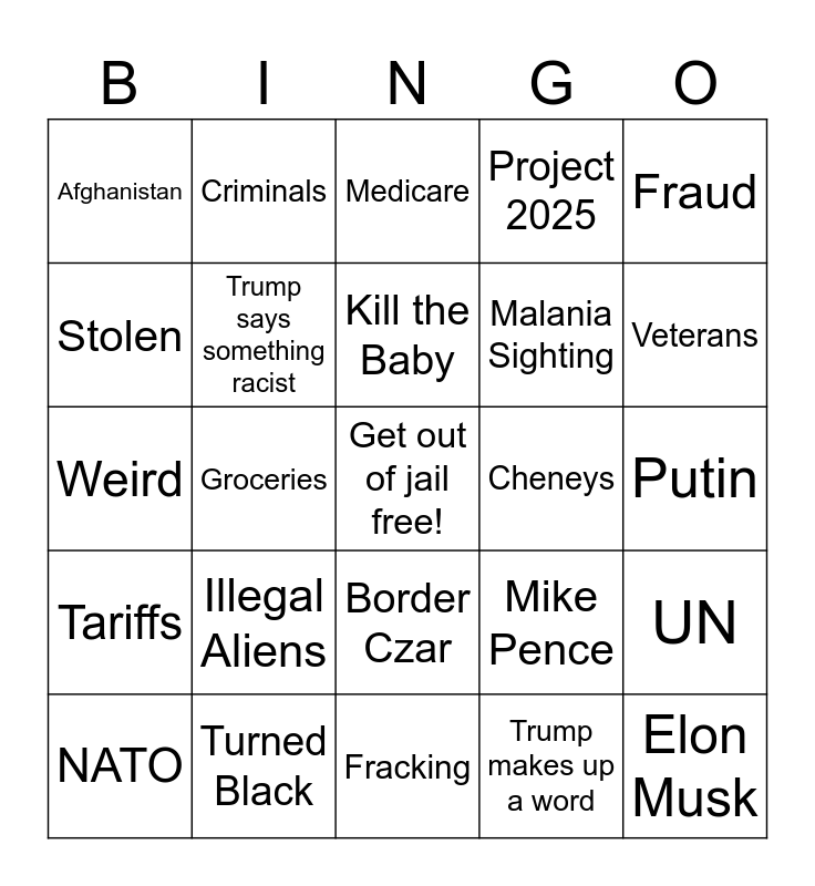 This bingo card has a free space and 89 words: Guns, Climate Crisis, Border Czar, Witch Hunt, Swamp, IVF, Energy Prices, Fentanyl, Hostages, Nancy Pelosi, Cognitive Test, They Love Me, UN, Putin, China, Kill the Baby, Not going back, Middle Class, World is laughing at Us, Child Tax Credit, Inflation, Gaza, Fracking, Cat lady, Weird, Turned Black, Nasty, Black jobs, Prosecuter, Unions, Project 2025, Groceries, Insulin, Afghanistan, Radical, Medicare, Stolen, Migrant Crimes, Veterans, NATO, Tariffs, Bit-Coin, Housing prices, January 6, Mike Pence, Cheneys, Horrible, Communist, Comrade, Criminals, Rapists, Terrible, Shootings, Kam-AHL-a, Sleepy Joe, Illegal Aliens, Hilary Clinton, Jewish, Israel, Palestine, Ukraine, Russia, Fake News, Liberal Media, Voter fraud, McDonalds, Obama Care, Department of Education, Drain the Swamp, Illegal Aliens, Elon Musk, RFK jr., Insulting the Moderators, Malania Sighting, Trump says something racist, Trump makes up a word, Reference to age, Crooked, Felon, Hush Money, Fraud, Semi-conductors, Reference to social media, MAGA, Capital Gains, Joy, BRAT, Witch Hunt and Transphobic Remark.