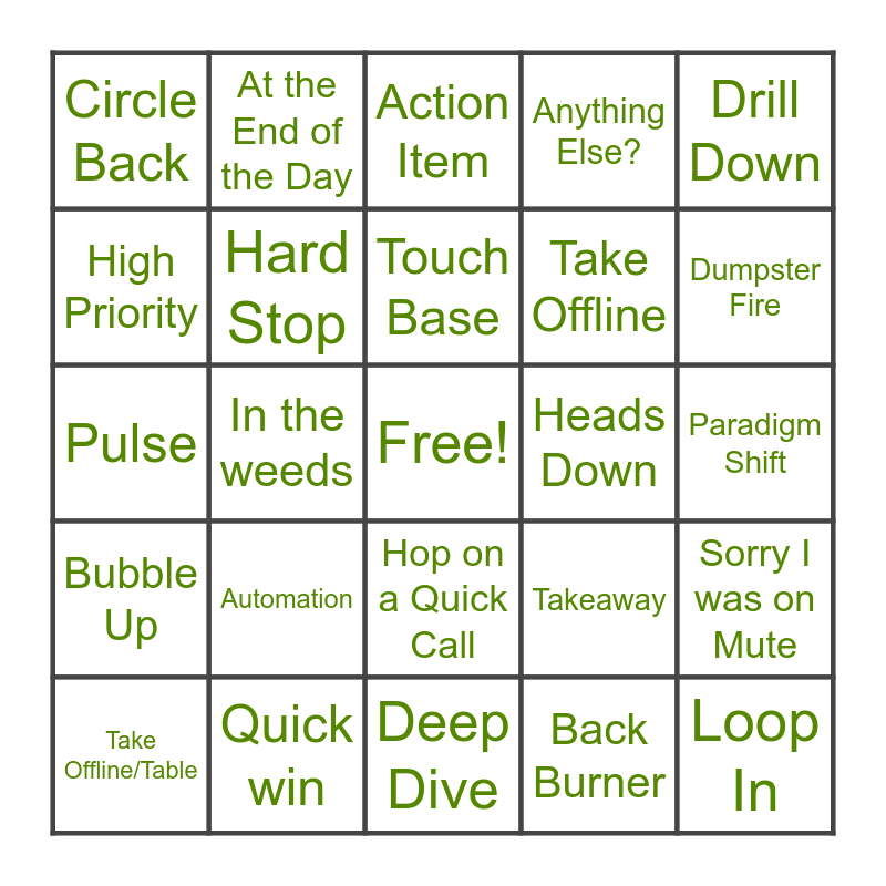This bingo card has a free space and 55 words: Put a Pin in it, Take Offline/Table, I'll Give you Back x Minutes, Circle Back, Deep Dive, We'll give it just another minute, Hard Stop, Bandwidth, Take Offline, Showstopper, Anything Else?, You're on mute, Can you see my screen?, Pivot, Bring back to the Surface, High Level, Drill Down, In the weeds, Leverage, Loop In, Heads Down, Ping, Takeaway, Action Item, Touchpoint, Touch Base, Back Burner, Backlog, Paradigm Shift, Sorry I was on Mute, Housekeeping, Continuity, Finish Line, Critical, High Priority, Pulse, Reach Out, Bubble Up, Tick and Tie, Low-Hanging Fruit, At the End of the Day, Agile, Best Practice, Wheelhouse, Automation, Quick win, DevOps, On your radar, Ducks in a row, Dumpster Fire, Punt/Kick, Sidebar, Deliverable, Hop on a Quick Call and Jira.