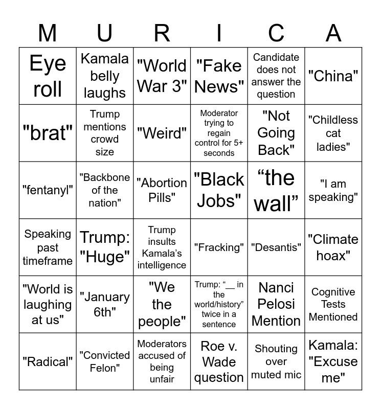 This bingo card has 47 words: Free!, "fentanyl", "6 week abortion ban", "Desantis", “the wall”, Trump: “__ in the world/history” twice in a sentence, Kamala belly laughs, Kamalas ethnicity is questioned, "China", "Convicted Felon", "brat", "Fake News", Trump: "Huge", Speaking past timeframe, Shouting over muted mic, "We the people", Trump mentions crowd size, "Backbone of the nation", "Project 2025", Candidate does not answer the question, "Childless cat ladies", "Climate hoax", Eye roll, "Weird", "Sleepy joe", Moderator trying to regain control for 5+ seconds, Trump insults Kamala’s intelligence, Kamala corrects trumps pronunciation, "I am speaking", "Black Jobs", "Perfectly Innocent", "January 6th", Roe v. Wade question, Kamala: "Excuse me", Moderators accused of being unfair, "Fracking", "Abortion Pills", "Radical", Trump: "They Love Me", Nanci Pelosi Mention, "World is laughing at us", "World War 3", "Not Going Back", "Make America Great Again", "Groceries", Cognitive Tests Mentioned and "Ceasefire".