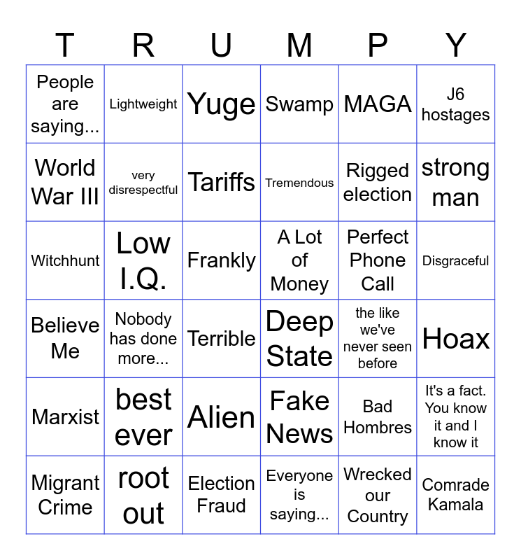 This bingo card has 45 words: Free!, Witchhunt, RINO, Terrible, Fake News, Hoax, Yuge, Bigly, MAGA, Deep State, Swamp, Low I.Q., Disgraceful, Perfect Phone Call, Everyone is saying..., the like we've never seen before, It's a fact. You know it and I know it, Rigged election, Very unfair, Tremendous, Lightweight, Migrant Crime, Bad Hombres, People are saying..., Persecuted, Frankly, best ever, Cheating, Believe Me, A Lot of Money, Build the Wall, Nobody has done more..., Election Fraud, Wrecked our Country, root out, strong man, Alien, Comrade Kamala, Marxist, very disrespectful, J6 hostages, Tariffs, 1929-style depression, World War III and ‘late great’ Hannibal Lector.
