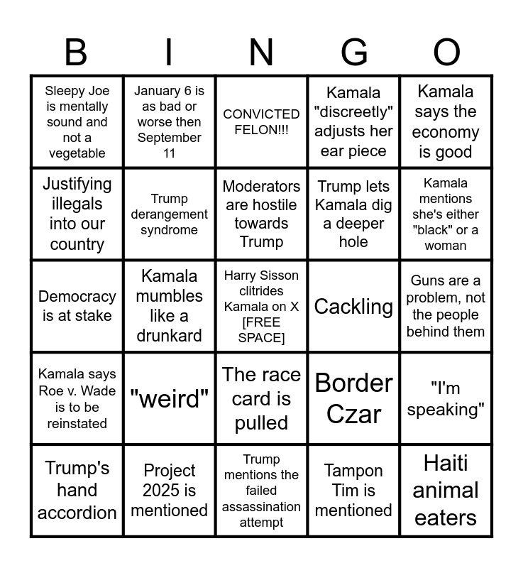 TRUMP-KAMALA DEBATE 9/10/24 | Mamala v. Cheeto 2024 Debate | MAKE BINGO GREAT AGAIN | Presidential Debate Bingo | Harris-Trump Election Debate Bingo