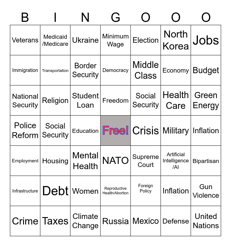 This bingo card has a free space and 48 words: Foreign Policy, Economy, Russia, Social Security, Student Loan, Inflation, Medicaid /Medicare, Taxes, North Korea, NATO, Jobs, Minimum Wage, Health Care, Social Security, Infrastructure, Military, Immigration, Budget, Inflation, Election, Middle Class, Education, Veterans, Transportation, Gun Violence, Border Security, Green Energy, Crime, Freedom, Religion, Defense, Crisis, Bipartisan, Debt, Police Reform, Supreme Court, Artificial Intelligence /AI, National Security, Mental Health, Women, Employment, United Nations, Ukraine, Climate Change, Democracy, Reproductive Health/Abortion, Housing and Mexico.
