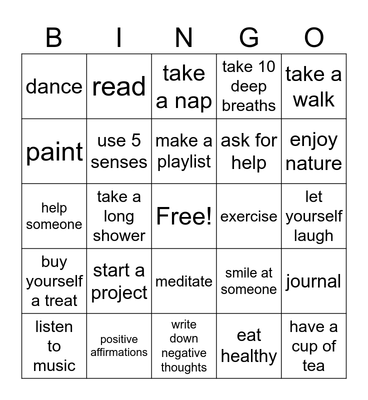 This bingo card has a free space and 29 words: listen to music, pet a dog, take a long shower, cook a special meal, dance, take a nap, use 5 senses, start a project, exercise, positive affirmations, let yourself laugh, have a cup of tea, write down negative thoughts, eat healthy, enjoy nature, talk to someone, meditate, buy yourself a treat, take a walk, help someone, smile at someone, watch an episode, ask for help, paint, take 10 deep breaths, read, journal, make a playlist and clean up.