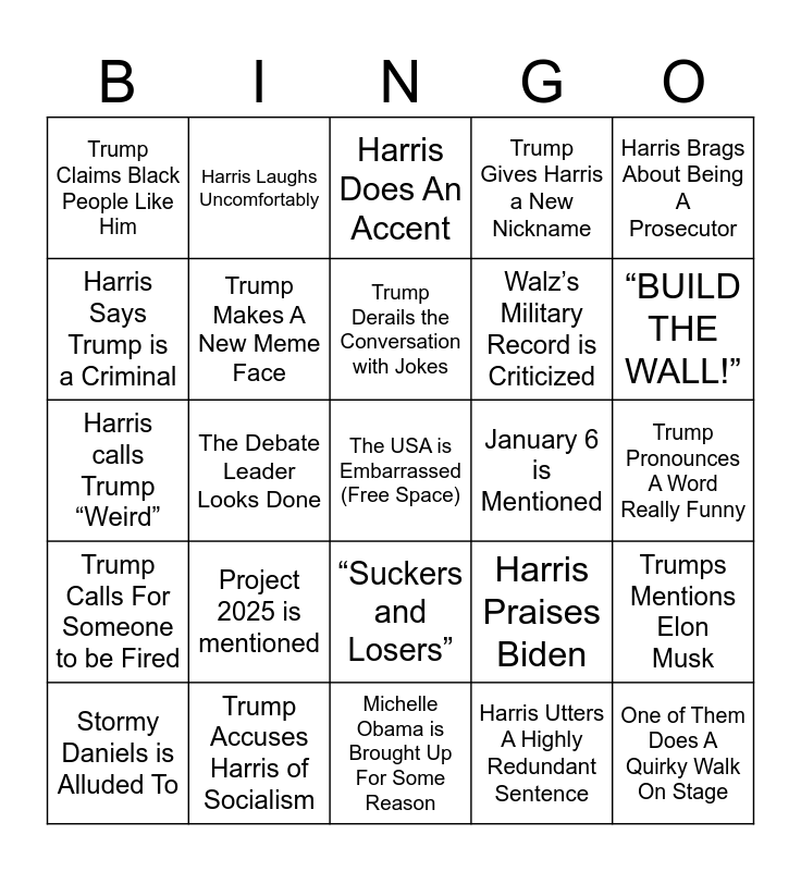 This bingo card has a free space and 24 words: Project 2025 is mentioned, Trump Accuses Harris of Socialism, Trump Derails the Conversation with Jokes, Stormy Daniels is Alluded To, Harris Brags About Being A Prosecutor, Trump Claims Black People Like Him, Harris Says Trump is a Criminal, Harris Laughs Uncomfortably, January 6 is Mentioned, “Suckers and Losers”, Walz’s Military Record is Criticized, Harris calls Trump “Weird”, Harris Praises Biden, Trumps Mentions Elon Musk, Trump Makes A New Meme Face, Harris Utters A Highly Redundant Sentence, Trump Pronounces A Word Really Funny, Harris Does An Accent, “BUILD THE WALL!”, The Debate Leader Looks Done, One of Them Does A Quirky Walk On Stage, Trump Calls For Someone to be Fired, Trump Gives Harris a New Nickname and Michelle Obama is Brought Up For Some Reason.