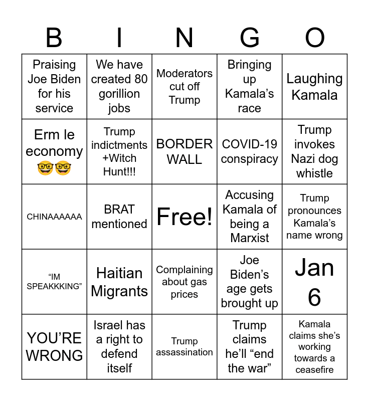 This bingo card has a free space and 24 words: Haitian Migrants, Israel has a right to defend itself, BORDER WALL, YOU’RE WRONG, Laughing Kamala, Praising Joe Biden for his service, Erm le economy 🤓🤓, We have created 80 gorillion jobs, Accusing Kamala of being a Marxist, Complaining about gas prices, COVID-19 conspiracy, CHINAAAAAA, Joe Biden’s age gets brought up, Jan 6, Trump indictments +Witch Hunt!!!, Trump claims he’ll “end the war”, Trump pronounces Kamala’s name wrong, Moderators cut off Trump, Trump invokes Nazi dog whistle, BRAT mentioned, Kamala claims she’s working towards a ceasefire, “IM SPEAKKKING”, Bringing up Kamala’s race and Trump assassination.