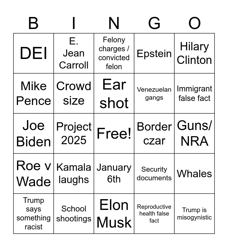 This bingo card has a free space and 29 words: Trump says something racist, Eye roll 🙄, Project 2025, Taylor Swift, DEI, Felony charges / convicted felon, Crowd size, Kamala laughs, Border czar, School shootings, Guns/ NRA, Trump is misogynistic, Elon Musk, Reproductive health false fact, Immigrant false fact, Black jobs, January 6th, Roe v Wade, Hilary Clinton, Joe Biden, Security documents, Barack Obama, Venezuelan gangs, Mike Pence, Epstein, E. Jean Carroll, Whales, Ear shot and Building the wall.