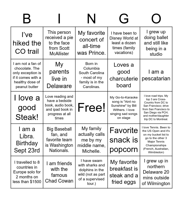 This bingo card has a free space and 37 words: Bread, that can be a love language right?, My favorite role in life is being an Aunt, I live in DC, My parents live in Delaware, I love Tennis. Been to the US Open and it's on my bucket list to go to the other 3 Major Tennis Championships (French, Australian, Wimbledon), Big Baseball fan, and favorite team is Washington Nationals., Born in Columbia South Carolina - most of my family is in the Carolinas., I was a debutante in High School (and yes I wore the white dress), I grew up doing ballet and still like being in a studio, I do yoga about 3 classes / week, Love reading and have a bedside book, audio book, and ipad book in progress at all times, I have been to Disney World at least a dozen times (family vacations), I grew up in northern Delaware 20 mins outside of Wilmington, I love road trips. My top 3 are Cross-Country from DC to San Francisco; drive from San Francisco to San Diego via PCH; and mother/daughter trip DC to Montreal., I am not a fan of chocolate. The only exception is if it comes with a healthy dose of peanut butter, I am a Libra. Birthday Sept 23rd, My favorite word game is Turntable (how many words you can create from a combination of 6 letters)., My favorite concert of all-time was Prince., My family actually calls me by my middle name, Michelle., My Go-to-Karaoke song is "Aint no Sunshine" by Bill Withers. I love singing sad songs on stage, I’ve hiked the CO trail, I am a pescatarian, I travelled to 8 countries in Europe solo for 2 months on less than $1500, I have swam with sharks and dolphins in the wild (not as part of a supervised tour.), I have been down a gold mine, diamond mine and coal mine, My favorite breakfast is steak and a fried eggs, This person received a pie to the face from Scott McAllister, This person is known as the GOAT, I had 2 poems published, My great grandmother was Frank Sinatra's baby sitter, I walked on my college basketball team, I am friends with the famous Chad Cowan, I love a good Steak!, Favorite snack is chocolate covered almonds, Favorite snack is popcorn, Loves a good charcuterie board and favorite flower is bright roses.