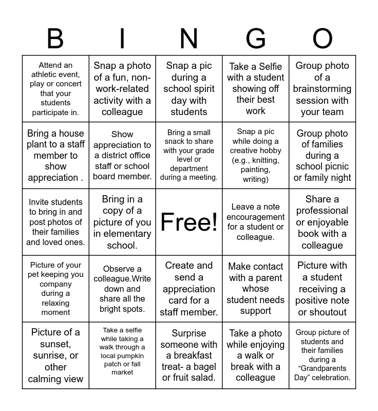 This bingo card has a free space and 24 words: Observe a colleague.Write down and share all the bright spots., Take a selfie while taking a walk through a local pumpkin patch or fall market, Bring a small snack to share with your grade level or department during a meeting., Picture of a sunset, sunrise, or other calming view, Group photo of a brainstorming session with your team, Attend an athletic event, play or concert that your students participate in., Bring a house plant to a staff member to show appreciation ., Snap a photo of a fun, non-work-related activity with a colleague, Leave a note encouragement for a student or colleague., Create and send a appreciation card for a staff member., Snap a pic while doing a creative hobby (e.g., knitting, painting, writing), Invite students to bring in and post photos of their families and loved ones., Make contact with a parent whose student needs support, Picture with a student receiving a positive note or shoutout, Show appreciation to a district office staff or school board member., Take a photo while enjoying a walk or break with a colleague, Share a professional or enjoyable book with a colleague, Snap a pic during a school spirit day with students, Group photo of families during a school picnic or family night, Bring in a copy of a picture of you in elementary school., Group picture of students and their families during a “Grandparents Day” celebration., Picture of your pet keeping you company during a relaxing moment, Take a Selfie with a student showing off their best work and Surprise someone with a breakfast treat- a bagel or fruit salad..