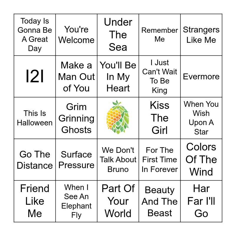 This bingo card has a free space and 48 words: Let It Go, Har Far I'll Go, Can You Feel The Love Tonight, Part Of Your World, Surface Pressure, Duck Tails, You're Welcome, You've Got a Friend in Me, I2I, Lost In The Woods, Make a Man Out of You, Remember Me, Colors Of The Wind, For The First Time In Forever, I Wanna Be Like You, Into The Unknown, You'll Be In My Heart, Kiss The Girl, A Whole New World, Strangers Like Me, Grim Grinning Ghosts, Beauty And The Beast, Today Is Gonna Be A Great Day, I Just Can't Wait To Be King, Try Everything, Evermore, Friend Like Me, I'm Still Here, We Don't Talk About Bruno, Go The Distance, Hawaiian Roller Coaster Ride, What's This, Supercali fragilistic ecpiali docious, Be Prepared, When I See An Elephant Fly, Rainbow Connection, Heigh-Ho, When You Wish Upon A Star, Do You Want To Build A Snowman?, Jack's Lament, Be Our Guest, Life is a Highway, Under The Sea, Movin' Right Along, This Is Halloween, I See The Light, Shiny and Son Of Man.