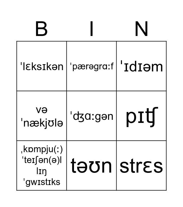 This bingo card has 45 words: ˈfəʊniːm, ˈmɔːfiːm, ˈsɪntæks, sɪˈmæntɪks, prægˈmætɪks, ˈdaɪəlɛkt, ˈɪdɪəm, kəˈləʊkwɪəlɪzm, ˈʤɑːgən, slæŋ, vəˈnækjʊlə, ˈlɪŋgwə ˈfræŋkə, baɪˈlɪŋgwəl, ˌmʌltɪˈlɪŋgwəl, fəʊˈnɛtɪks, fəʊˈnɒləʤi, mɔːˈfɒləʤi, ˈgræmə, klɔːz, ˈsɛntəns, ˈpærəgrɑːf, dɪsˈkɔːs, ˌɛtɪˈmɒləʤi, ˈlɛksɪkən, ˈæksənt, ˌɪntəʊˈneɪʃən, ˈrɛtərɪk, ˈsɪmbəl, ˈsɪgnɪfaɪə, ˈsɪgnɪfaɪd, kəʊd-ˈswɪʧɪŋ, ˈlæŋgwɪʤ ˈkɒntækt, ˈlæŋgwɪʤ ʧeɪnʤ, taɪˈpɒləʤi, ˌrɛləˈtɪvɪti, ˌjuːnɪˈvɜːsəlz, ˌveərɪˈeɪʃən, ˈrɛʤɪstə, staɪl, təʊn, pɪʧ, strɛs, prægˈmætɪks, ˌkɒmpju(ː)ˈteɪʃən(ə)l lɪŋˈgwɪstɪks and fəˈrɛnsɪk lɪŋˈgwɪstɪks.
