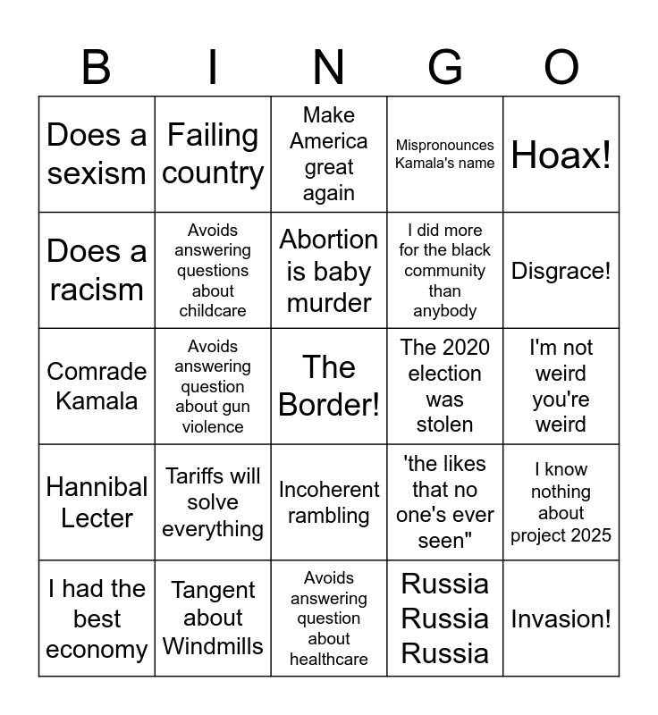 This bingo card has a free space and 24 words: Tariffs will solve everything, Tangent about Windmills, Abortion is baby murder, I had the best economy, Hoax!, Does a sexism, Does a racism, Failing country, The 2020 election was stolen, Incoherent rambling, I did more for the black community than anybody, Comrade Kamala, 'the likes that no one's ever seen", I know nothing about project 2025, Avoids answering questions about childcare, Russia Russia Russia, I'm not weird you're weird, Make America great again, Disgrace!, Avoids answering question about gun violence, Invasion!, Hannibal Lecter, Mispronounces Kamala's name and Avoids answering question about healthcare.