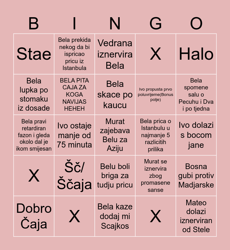 This bingo card has 25 words: Šč/Ščaja, Bela kaze dodaj mi Scajkos, Bela skace po kaucu, Dobro Čaja, Halo, Stae, Bela lupka po stomaku iz dosade, Bela prekida nekog da bi ispricao pricu iz Istanbula, Bela prica o Istanbulu u najmanje 5 razlicitih prilika, Belu boli briga za tudju pricu, Ivo propusta prvo poluvrijeme(Bonus polje), Bela pravi retardiran fazon i gleda okolo dal je ikom smijesan, Murat se iznervira zbog promasene sanse, Bosna gubi protiv Madjarske, BELA PITA CAJA ZA KOGA NAVIJAS HEHEH, Mateo dolazi iznerviran od Stele, Ivo dolazi s bocom jane, Vedrana iznervira Bela, Bela spomene salu o Pecuhu i Dva i po tjedna, Ivo ostaje manje od 75 minuta, Murat zajebava Belu za Aziju, X, X, X and X.