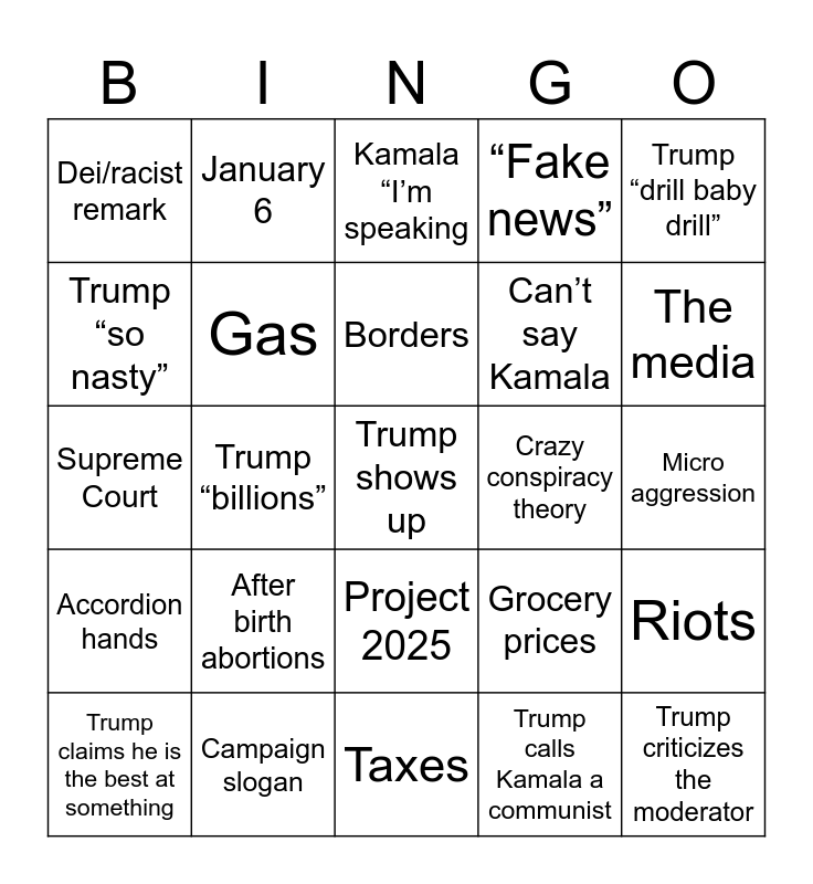 This bingo card has a free space and 24 words: After birth abortions, Campaign slogan, Borders, Trump claims he is the best at something, Trump “drill baby drill”, Dei/racist remark, Trump “so nasty”, January 6, Crazy conspiracy theory, Project 2025, Can’t say Kamala, Supreme Court, Grocery prices, Riots, Gas, Trump calls Kamala a communist, Micro aggression, Kamala “I’m speaking, The media, Trump “billions”, Trump criticizes the moderator, Accordion hands, “Fake news” and Taxes.