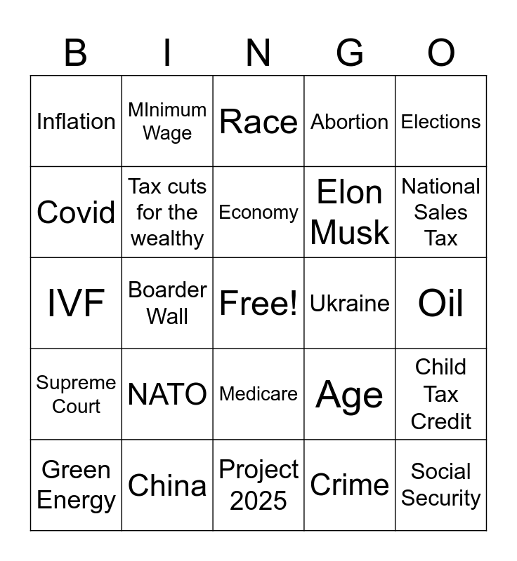 This bingo card has a free space and 55 words: Afghanistan, Green Energy, Tariffs, Inflation, Project 2025, Education, Tax cuts for the wealthy, Reduce Corporate Tax Rate, Elon Musk, Robert Kennedy, Abortion, Democracy, Tax cuts for the middle class, Home ownership, Small business, January 6, Elections, Boarder Wall, Illegal Immigration, Social Security, Ukraine, Budget Deficit, Age, Race, Felonies, Economy, Crime, Reproductive Rights, Oil, Child Tax Credit, Unions, Fentanyl, Birthright Citizenship, Boarder Bill, Covid, IVF, Health Insurance, Supreme Court, Transgender, Guns, MInimum Wage, Tips, Homeless, Russia, NATO, China, Mexico, Israel, Hamas, National Sales Tax, Police, AI, Student Loans, Medicare and Biden.