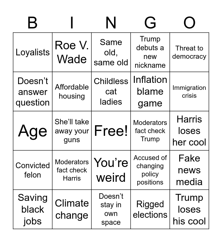 This bingo card has a free space and 39 words: Harris covers up Biden’s dementia, Weaponized judicial system, I’ve done nothing wrong, Affordable housing, Saving black jobs, You’re weird, Childless cat ladies, Cozy with authoritarian leaders, Threat to democracy, Convicted felon, She’ll take away your guns, Trump debuts a new nickname, Trump loses his cool, Harris loses her cool, Moderators fact check Trump, Moderators fact check Harris, Project 2025, Loyalists, Fracking, Accused of changing policy positions, Doesn’t answer question, Doesn’t stay in own space, Inflation blame game, Immigration crisis, Reproductive Rights, Strengthen the miiddle class, I’ll solve the problems very quickly, Corporate tax cuts, Child care tax credits, Roe V. Wade, Tariffs, Drug prices, Same old, same old, Climate change, Rigged elections, Voter rights, Fake news media, Age and Incoherent speeches.