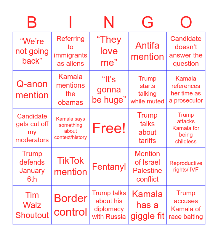 This bingo card has a free space and 35 words: Trump mispronounces Kamala’s name, Hunter Biden, “Sleepy joe”, Kamala mentions the obamas, Fentanyl, Antifa mention, Q-anon mention, Trump denies his convictions, “It’s gonna be huge”, Attempt at a pop culture reference, Candidate gets cut off my moderators, Candidate doesn’t answer the question, Allusion to couches, “MAGA”, “We’re not going back”, Trump talks about tariffs, Kamala has a giggle fit, Kamala says something about context/history, Trump defends January 6th, Trump accuses Kamala of race baiting, Mention of Israel Palestine conflict, Tim Walz Shoutout, Reproductive rights/ IVF, Border control, “They love me”, Kamala references her time as a prosecutor, Project 2025 mention, Talk of fake news being spread, Trump starts talking while muted, Trump attacks Kamala for being childless, “Drill baby drill”, Trump talks about his diplomacy with Russia, TikTok mention, Referring to immigrants as aliens and Outward misogyny.