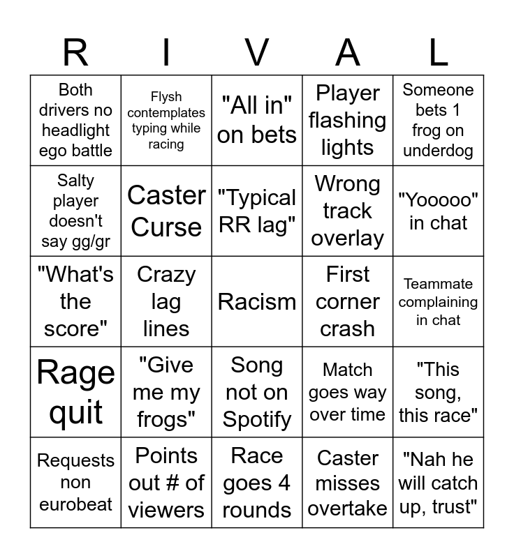 This bingo card has a free space and 24 words: "Give me my frogs", Points out # of viewers, "Typical RR lag", Requests non eurobeat, Someone bets 1 frog on underdog, Both drivers no headlight ego battle, Salty player doesn't say gg/gr, Flysh contemplates typing while racing, First corner crash, Song not on Spotify, Wrong track overlay, "What's the score", Match goes way over time, "This song, this race", Caster Curse, Caster misses overtake, Teammate complaining in chat, "All in" on bets, "Yooooo" in chat, Crazy lag lines, "Nah he will catch up, trust", Rage quit, Player flashing lights and Race goes 4 rounds.