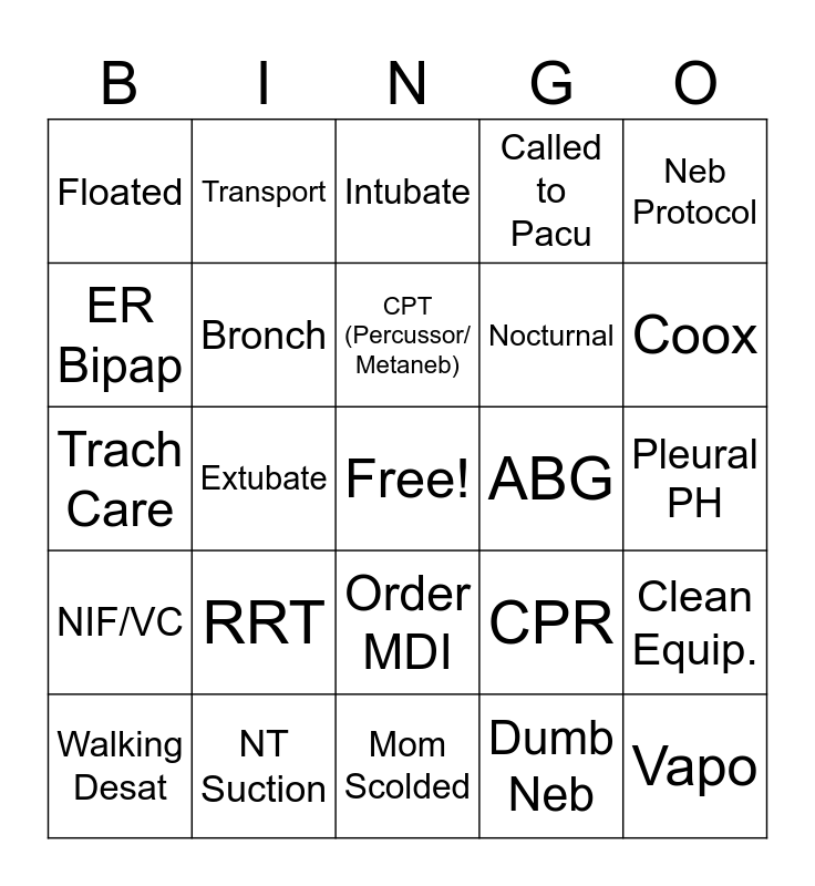 This bingo card has a free space and 24 words: RRT, NT Suction, CPT (Percussor/ Metaneb), Walking Desat, Neb Protocol, Floated, ER Bipap, Transport, ABG, Order MDI, Nocturnal, Trach Care, CPR, Clean Equip., Bronch, Dumb Neb, Pleural PH, Intubate, Coox, Extubate, Vapo, NIF/VC, Called to Pacu and Mom Scolded.