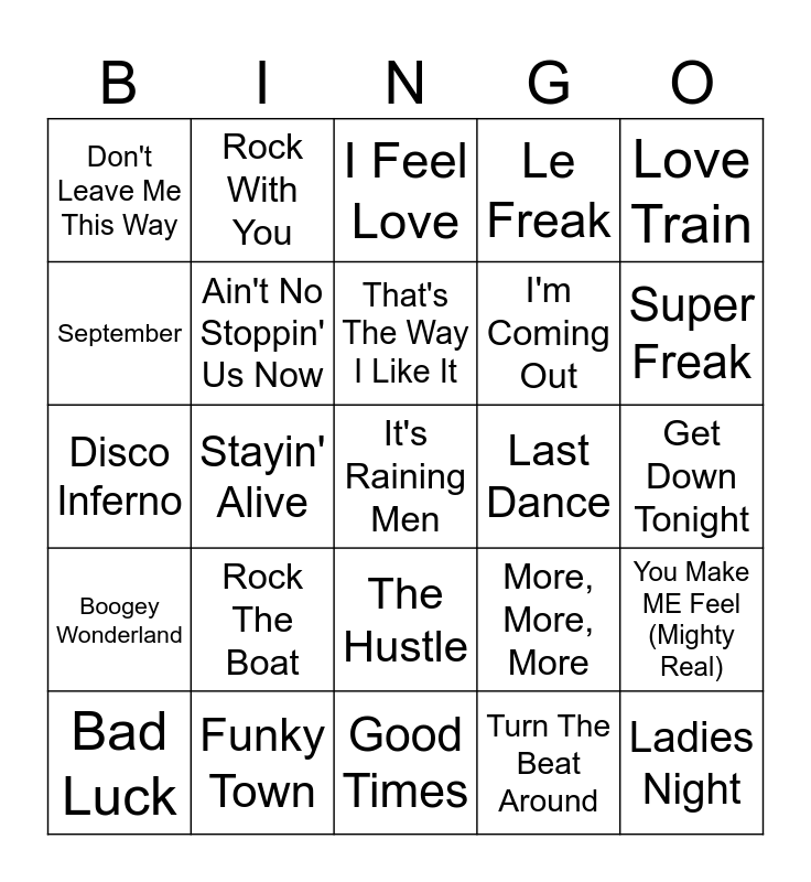 This bingo card has 40 words: Night Fever, Disco Inferno, We Are Family, Ain't No Stoppin' Us Now, Funky Town, The Hustle, That's The Way I Like It, Heaven Must Be Missing n Angel, Love Train, Boogey Wonderland, Stayin' Alive, Le Freak, It's Raining Men, Get Down Tonight, Last Dance, Rock The Boat, Knock On Wood, Don't Leave Me This Way, YMCA, I Feel Love, You Make ME Feel (Mighty Real), Turn The Beat Around, I'm Coming Out, September, Rappers Delight, TSOP (The Sound Of Philadelphia), Celebration, Let's Groove, Ladies Night, Boogie Oogie Oogie, Car Wash, Bad Luck, Rock Your Baby, More, More, More, Super Freak, Good Times, Ring My Bell, Never Can Sy Goodbye, Rock With You and Stomp!.