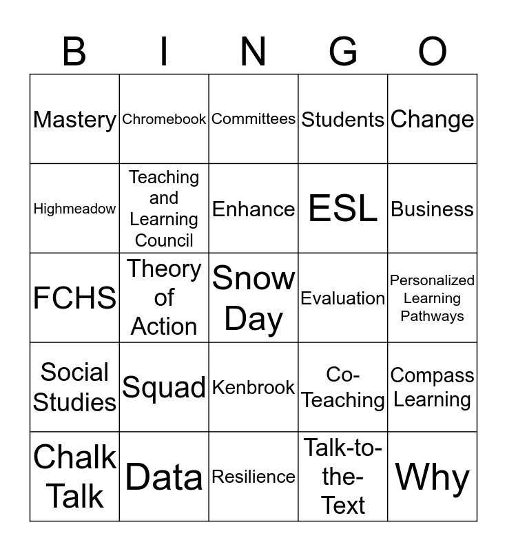 This bingo card has 133 words: E3, Values, Bond, FHS, Grandchildren, Modern Teacher, Social Studies, PD, FOB, Coherence, MEA, Mission, Growth Mindset, Goals, Timeline, NewsELA, Why, Music, Construction, Brainstorm, Arts, Data, Snow Day, Ideas, Apple, World Languages, Enhance, Engage, Empower, Math, ESL, Chromebook, Compass Learning, Business, Pencil, Achievement, Reader’s Apprenticeship, Science, ELA, Kids, Students, Printers, Classroom, Badges, FollowMe, Lunch, Picnic, Marzano, Evaluation, Change, Growth, Transition, Teaching and Learning Council, Fixed Mindset, Furniture, Cultures of Thinking, F/FH Education Foundation, Cold Day, Vision, Theory of Action, FCHS, HHS, NFHS, East, Power, Warner, Beechview, Forest, Gill, Highmeadow, Hillside, Kenbrook, Lanigan, Longacre, Wood Creek, Alameda, Visions, Grandchildren, Backwards by Design, MTSS, IST, Power Standards, Positive Expectations, Personalized Learning Pathways, Assistive Technology, Resource, Journey, Feedback, Synthesize, System-wide, Teaching and Learning Council, Student Success, Proactive, IObservation, Resilience, Grit, Common Core, Michael Fullan, Conversations, Strategies, Team, Squad, Committees, Relationships, Collaboration, Rigor, Trust, Instructional Plan, Culture, Chart paper, Voice, Chalk Talk, Routines, Talk-to-the-Text, Annotate, Literacy, Proficient, Mastery, Special Education, Co-Teaching, Data Boards, NWEA, Google, Restorative Practices, IEP, 504, ELL, Lesson plan, Learning Target, Formal scales, George Heitsch, Aaron Johnson and Oakland Schools.