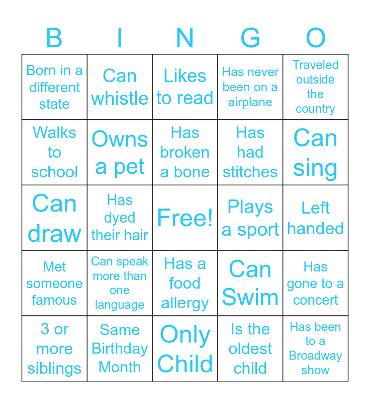 This bingo card has a free space and 24 words: 3 or more siblings, Can speak more than one language, Has broken a bone, Is the oldest child, Traveled outside the country, Born in a different state, Can whistle, Likes to read, Plays a sport, Left handed, Can draw, Owns a pet, Can Swim, Has gone to a concert, Walks to school, Same Birthday Month, Only Child, Has never been on a airplane, Can sing, Met someone famous, Has dyed their hair, Has a food allergy, Has had stitches and Has been to a Broadway show.