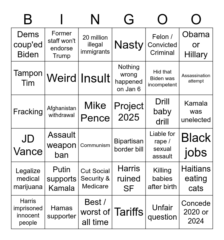 This bingo card has 36 words: Harris ruined SF, Cut Social Security & Medicare, Tariffs, Tampon Tim, JD Vance, Project 2025, Weird, Best / worst of all time, Felon / Convicted Criminal, Killing babies after birth, Assassination attempt, Nasty, Haitians eating cats, Afghanistan withdrawal, Nothing wrong happened on Jan 6, Dems coup'ed Biden, Legalize medical marijuana, Drill baby drill, Fracking, 20 million illegal immigrants, Mike Pence, Assault weapon ban, Bipartisan border bill, Communism, Liable for rape / sexual assault, Former staff won't endorse Trump, Hid that Biden was incompetent, Hamas supporter, Insult, Obama or Hillary, Concede 2020 or 2024, Harris imprisoned innocent people, Black jobs, Kamala was unelected, Putin supports Kamala and Unfair question.