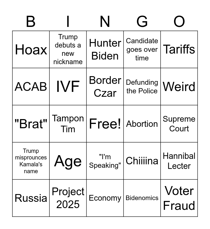 This bingo card has a free space and 44 words: "Black Jobs", Voter Fraud, Ukraine, Russia, Did you just fall out of a coconut tree???, Bidenomics, Hunter Biden, Kamala Cackle, Tariffs, Project 2025, Candidate goes over time, Abortion, "I'm Speaking", Age, Cognitive Ability, Economy, Crowd Size, "Brat", Obama, Weird, Trump debuts a new nickname, Talking over eachother, Childless Cat Lady, Hoax, Gas Prices, Supreme Court, Biden's Age, Inflation, Chiiiina, Trump misprounces Kamala's name, Sexism, Hannibal Lecter, Couch Refrence, Comrade Kamala, Tampon Tim, Muting of the Mics, Assassination Attemp, Jesus, Border Czar, ACAB, Defunding the Police, No Taxes on Tips, IVF and Convicted Felon.