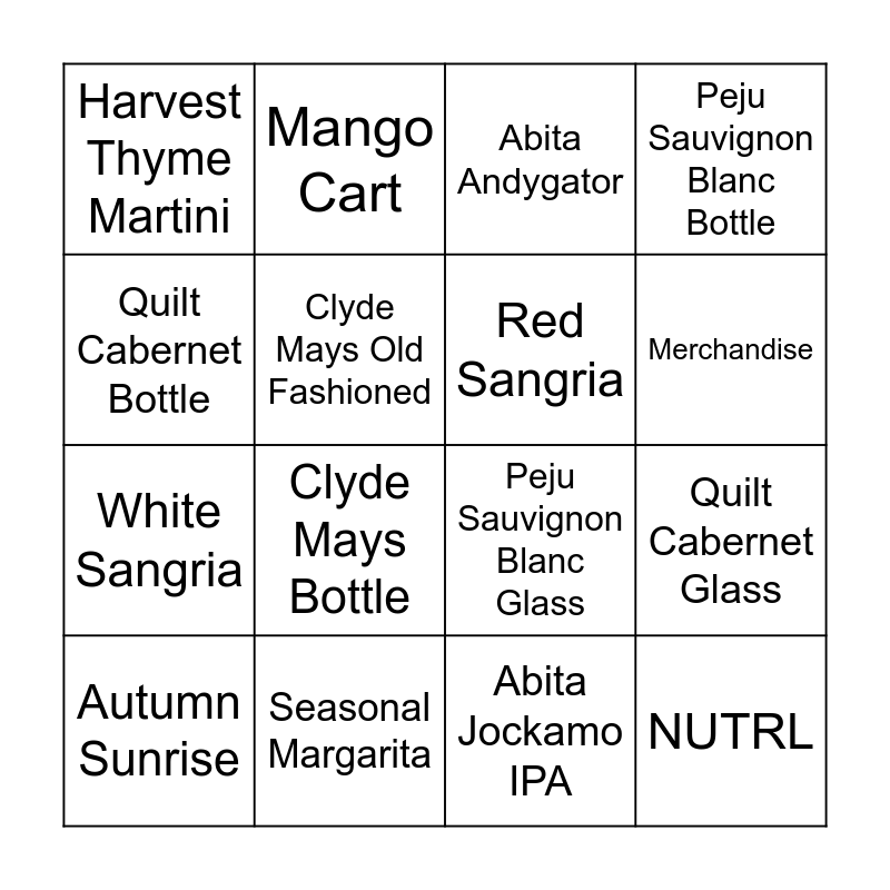 This bingo card has 16 words: Seasonal Margarita, Quilt Cabernet Glass, Abita Andygator, Harvest Thyme Martini, White Sangria, Mango Cart, Peju Sauvignon Blanc Glass, Abita Jockamo IPA, Quilt Cabernet Bottle, Clyde Mays Old Fashioned, Autumn Sunrise, Peju Sauvignon Blanc Bottle, Clyde Mays Bottle, Merchandise, Red Sangria and NUTRL.