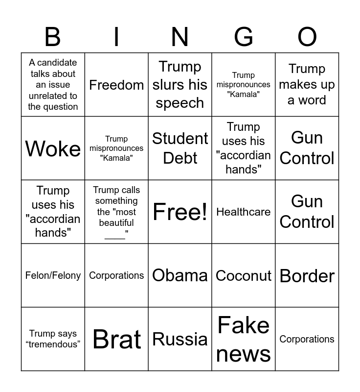 This bingo card has a free space and 132 words: Freedom, Border, Gun Control, Wealth Tax, Billionaire, Immigration, Felon/Felony, January 6th, "I'm speaking", Trump mispronounces "Kamala", Reproductive Rights, China, Russia, Abortion, Workers, Age/Old, Crime, "Make America Great Again"/MAGA, Trump makes up a word, Trump slurs his speech, Coconut, Brat, Corporations, Climate Change, "Opportunity Economy", Unity, Student Debt, Trump interrupts Harris, Trump starts a story "People are telling me...", "Most beautiful ____", Trump uses his "accordian hands", Freedom, Border, Gun Control, Wealth Tax, Billionaire, Immigration, Felon/Felony, January 6th, "I'm speaking", Trump mispronounces "Kamala", Reproductive Rights, China, Russia, Abortion, Workers, Age of candidate is discussed, Crime, "Make America Great Again"/MAGA, Trump makes up a word, Trump slurs his speech, Coconut, Corporations, Climate Change, "Opportunity Economy", Unity, Student Debt, Trump interrupts Harris, Trump starts a story "People are telling me...", Trump calls something the "most beautiful ____", Trump uses his "accordian hands", Fake news, Race, Racial/ethnic slur, Sexist comment, Putin, Israel, Gaza, Deficit, Woke, Truth, Obama, Trump thinks he’s debating Biden, A candidate talks about an issue unrelated to the question, Inflation, Healthcare, Trump says “tremendous”, Drugs / fentanyl, Trump says “illegals”, Nukes / nuclear codes, Insurrection, Freedom, Border, Gun Control, Wealth Tax, Billionaire, Immigration, Felon/Felony, January 6th, "I'm speaking", Trump mispronounces "Kamala", Reproductive Rights, China, Russia, Abortion, Workers, Age of candidate is discussed, Crime, "Make America Great Again"/MAGA, Trump makes up a word, Trump slurs his speech, Coconut, Corporations, Climate Change, "Opportunity Economy", Unity, Student Debt, Trump interrupts Harris, Trump starts a story "People are telling me...", Trump calls something the "most beautiful ____", Trump uses his "accordian hands", Fake news, Race, Racial/ethnic slur, Sexist comment, Putin, Israel, Gaza, Deficit, Woke, Truth, Obama, Trump thinks he’s debating Biden, A candidate talks about an issue unrelated to the question, Inflation, Healthcare, Trump says “tremendous”, Drugs / fentanyl, Trump says “illegals”, Nukes / nuclear codes, Insurrection and Someone mentions the assassination attempt on Trump.