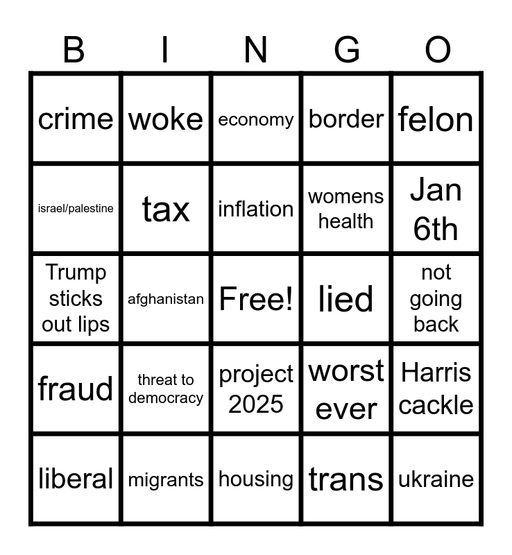 This bingo card has a free space and 24 words: threat to democracy, migrants, inflation, liberal, felon, crime, israel/palestine, woke, lied, project 2025, womens health, Trump sticks out lips, worst ever, Harris cackle, tax, trans, not going back, economy, Jan 6th, afghanistan, ukraine, fraud, border and housing.