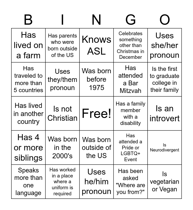 This bingo card has a free space and 24 words: Was born in the 2000's, Has worked in a place where a uniform is required, Was born before 1975, Speaks more than one language, Uses she/her pronoun, Has lived on a farm, Has traveled to more than 5 countries, Has parents who were born outside of the US, Has a family member with a disability, Was born outside of the US, Has attended a Bar Mitzvah, Has lived in another country, Has attended a Pride or LGBTQ+ Event, Is Neurodivergent, Uses they/them pronoun, Has been asked "Where are you from?", Is an introvert, Knows ASL, Is the first to graduate college in their family, Is not Christian, Is vegetarian or Vegan, Has 4 or more siblings, Celebrates something other than Christmas in December and Uses he/him pronoun.