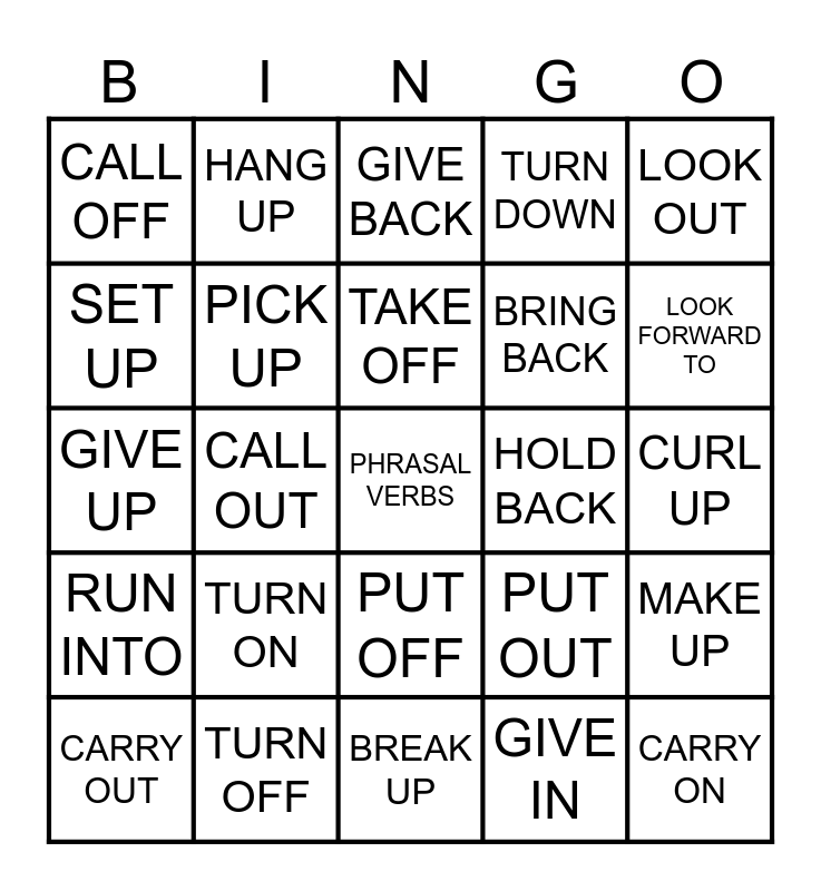 This bingo card has a free space and 24 words: TURN ON, TURN OFF, TAKE OFF, CARRY OUT, LOOK OUT, CALL OFF, SET UP, HANG UP, HOLD BACK, PUT OFF, BRING BACK, GIVE UP, PUT OUT, MAKE UP, PICK UP, GIVE IN, CURL UP, GIVE BACK, LOOK FORWARD TO, CALL OUT, CARRY ON, RUN INTO, TURN DOWN and BREAK UP.
