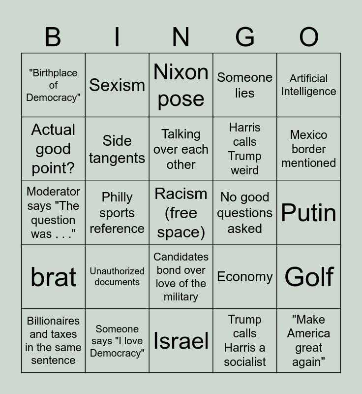 This bingo card has a free space and 44 words: China mentioned, "Make America great again", 34 felony charges, Billionaires and taxes in the same sentence, Drug prices, Trump calls Harris a socialist, Nixon pose, Complaints about the media, Artificial Intelligence, Someone says "I love Democracy", Someone lies, No good questions asked, Candidates bond over love of the military, Unauthorized documents, Trump talks over moderator, Israel, Mispronounced country name, Moderator says "The question was . . .", "Like no one has seen before", Mexico border mentioned, Sexism, Obviously rehearsed zinger, Project 2025, "Birthplace of Democracy", "The working class", Putin, "Coconut", "We're at a crossroads", Economy, brat, Obama, Golf, Stolen election, The middle class, Philly sports reference, "Billions and billions", Mispronounced name, Hannibal Lecter, Talking over each other, Actual good point?, Harris calls Trump weird, Kamala cackle, Side tangents and Trump avoids a question.