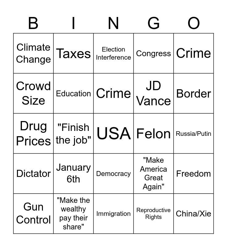 This bingo card has a free space and 29 words: Gun Control, Economy, "Finish the job", Age, Climate Change, Election Interference, Education, January 6th, Felon, "Make the wealthy pay their share", Russia/Putin, China/Xie, Immigration, Reproductive Rights, Border, 34 Counts, Democracy, Dictator, Crime, Drug Prices, "Make America Great Again", Joe Biden, JD Vance, Crowd Size, Congress, Taxes, Freedom, Crime and Housing.