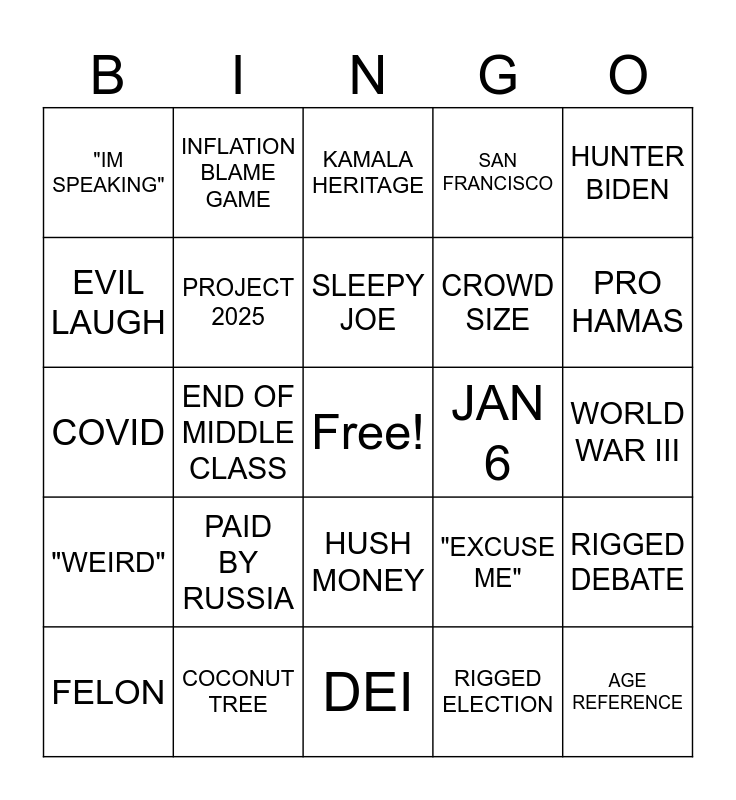 This bingo card has a free space and 24 words: PAID BY RUSSIA, COCONUT TREE, SLEEPY JOE, FELON, HUNTER BIDEN, "IM SPEAKING", EVIL LAUGH, INFLATION BLAME GAME, JAN 6, HUSH MONEY, CROWD SIZE, COVID, "EXCUSE ME", RIGGED DEBATE, PROJECT 2025, RIGGED ELECTION, WORLD WAR III, KAMALA HERITAGE, PRO HAMAS, END OF MIDDLE CLASS, AGE REFERENCE, "WEIRD", SAN FRANCISCO and DEI.