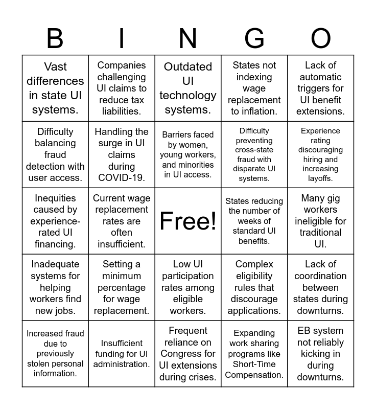 This bingo card has a free space and 24 words: Setting a minimum percentage for wage replacement., Insufficient funding for UI administration., Barriers faced by women, young workers, and minorities in UI access., Increased fraud due to previously stolen personal information., Lack of automatic triggers for UI benefit extensions., Vast differences in state UI systems., Difficulty balancing fraud detection with user access., Companies challenging UI claims to reduce tax liabilities., States reducing the number of weeks of standard UI benefits., Low UI participation rates among eligible workers., Difficulty preventing cross-state fraud with disparate UI systems., Inequities caused by experience-rated UI financing., Complex eligibility rules that discourage applications., Lack of coordination between states during downturns., Handling the surge in UI claims during COVID-19., Expanding work sharing programs like Short-Time Compensation., Many gig workers ineligible for traditional UI., Outdated UI technology systems., Experience rating discouraging hiring and increasing layoffs., Current wage replacement rates are often insufficient., EB system not reliably kicking in during downturns., Inadequate systems for helping workers find new jobs., States not indexing wage replacement to inflation. and Frequent reliance on Congress for UI extensions during crises..