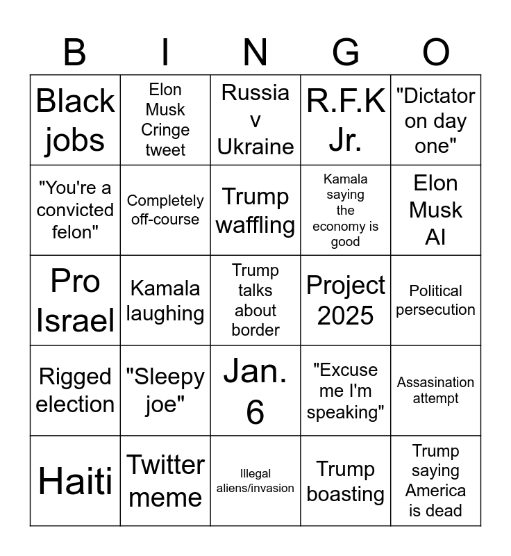 This bingo card has 25 words: "Sleepy joe", Illegal aliens/invasion, Trump waffling, Haiti, "Dictator on day one", Black jobs, "You're a convicted felon", Elon Musk Cringe tweet, Project 2025, Jan. 6, Kamala saying the economy is good, Pro Israel, "Excuse me I'm speaking", Assasination attempt, Completely off-course, Trump saying America is dead, Political persecution, Russia v Ukraine, Elon Musk AI, Kamala laughing, Trump talks about border, Twitter meme, Rigged election, R.F.K Jr. and Trump boasting.