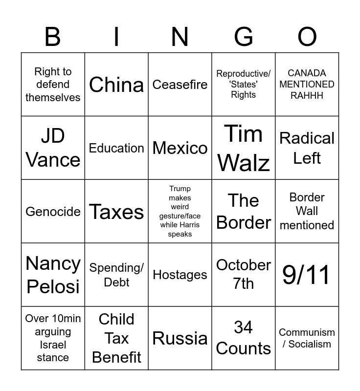 This bingo card has a free space and 47 words: Ukraine, Communism / Socialism, Project 2025, Russia, Spending/ Debt, Inflation, China, 'Immigrant Bad', JD Vance, TRUDEAU MENTIONED RAHH, Education, Reproductive/ 'States' Rights, 9/11, October 7th, 'Weird', Oil, Mexico, The Border, January 6th, CANADA MENTIONED RAHHH, Taxes, 34 Counts, Right to defend themselves, Tim Walz, Unions, Radical Left, Over 10min arguing Israel stance, Kamala's identity, Hostages, Nancy Pelosi, Joe Biden, SCOTUS mentioned, World is laughing at us, Trump's too old, Gaza, Child Tax Benefit, Border Wall mentioned, They love me, Climate Crisis, 'if I was your president', Not going back, Ceasefire, Genocide, WWIII, Horrible, Bernie Sanders mentioned (why) and The Middle East.