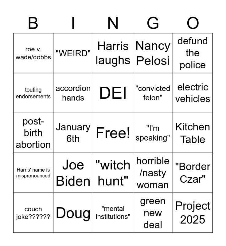 This bingo card has a free space and 31 words: "mental institutions", Trump's ear is mentioned, January 6th, "Not Going Back", roe v. wade/dobbs, Harris laughs, accordion hands, horrible /nasty woman, "I'm speaking", green new deal, Kitchen Table, Project 2025, Trump child sighting, $35 insulin, electric vehicles, China, "Border Czar", Joe Biden, Harris' name is mispronounced, "witch hunt", defund the police, "asylums", couch joke??????, "WEIRD", "convicted felon", touting endorsements, Nancy Pelosi, post-birth abortion, Doug, DEI and "woke".