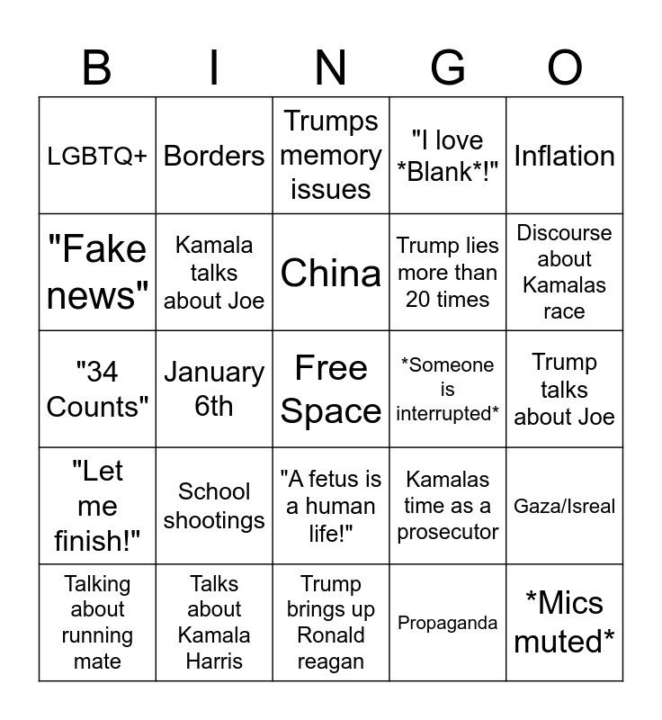 This bingo card has a free space and 24 words: School shootings, Talks about Kamala Harris, China, Talking about running mate, Inflation, LGBTQ+, "Fake news", Borders, *Someone is interrupted*, "A fetus is a human life!", Trump lies more than 20 times, "34 Counts", Kamalas time as a prosecutor, Gaza/Isreal, Kamala talks about Joe, Propaganda, Trump talks about Joe, Trumps memory issues, Discourse about Kamalas race, January 6th, *Mics muted*, "Let me finish!", "I love *Blank*!" and Trump brings up Ronald reagan.