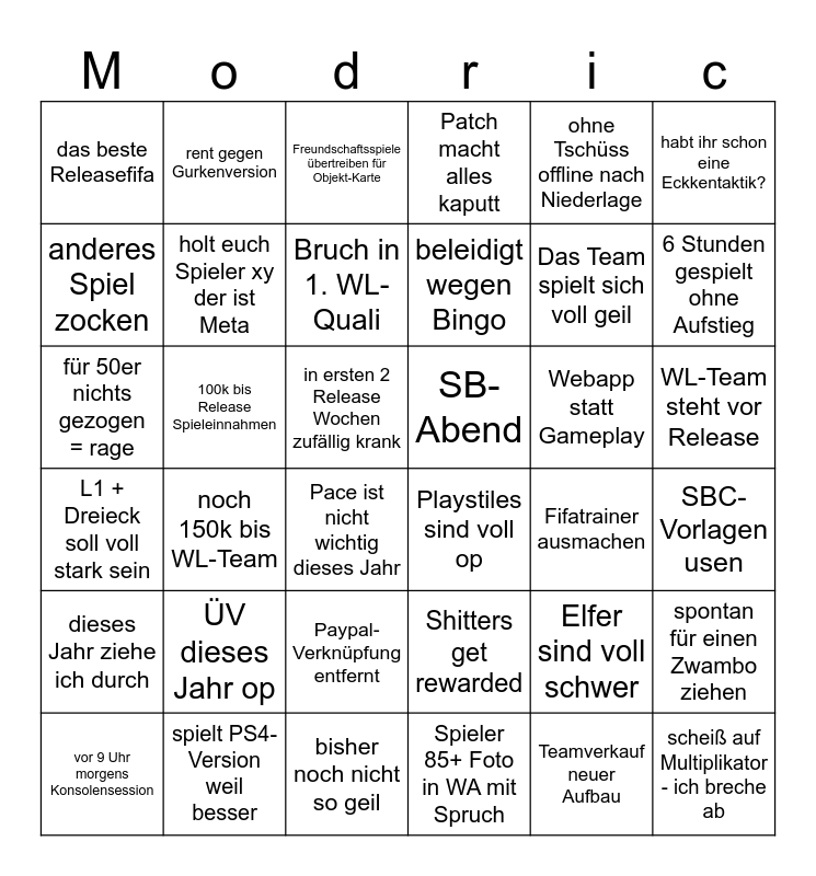 This bingo card has 36 words: Shitters get rewarded, Paypal-Verknüpfung entfernt, Spieler 85+ Foto in WA mit Spruch, anderes Spiel zocken, L1 + Dreieck soll voll stark sein, SB-Abend, holt euch Spieler xy der ist Meta, bisher noch nicht so geil, ohne Tschüss offline nach Niederlage, Elfer sind voll schwer, 6 Stunden gespielt ohne Aufstieg, Patch macht alles kaputt, spontan für einen Zwambo ziehen, 100k bis Release Spieleinnahmen, beleidigt wegen Bingo, das beste Releasefifa, dieses Jahr ziehe ich durch, Webapp statt Gameplay, für 50er nichts gezogen = rage, Freundschaftsspiele übertreiben für Objekt-Karte, in ersten 2 Release Wochen zufällig krank, noch 150k bis WL-Team, Playstiles sind voll op, Pace ist nicht wichtig dieses Jahr, Fifatrainer ausmachen, rent gegen Gurkenversion, Das Team spielt sich voll geil, spielt PS4-Version weil besser, Bruch in 1. WL-Quali, habt ihr schon eine Eckkentaktik?, scheiß auf Multiplikator - ich breche ab, vor 9 Uhr morgens Konsolensession, SBC-Vorlagen usen, WL-Team steht vor Release, ÜV dieses Jahr op and Teamverkauf neuer Aufbau.