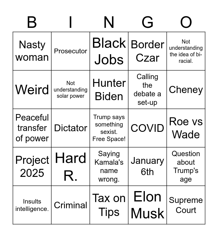 This bingo card has a free space and 24 words: Hard R., Criminal, Hunter Biden, Insults intelligence., Not understanding the idea of bi-racial., Nasty woman, Weird, Prosecutor, COVID, Saying Kamala's name wrong., Calling the debate a set-up, Peaceful transfer of power, January 6th, Question about Trump's age, Not understanding solar power, Elon Musk, Roe vs Wade, Black Jobs, Cheney, Dictator, Supreme Court, Project 2025, Border Czar and Tax on Tips.